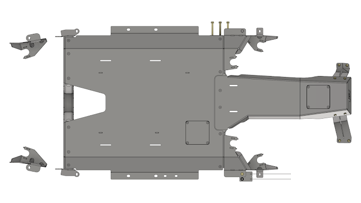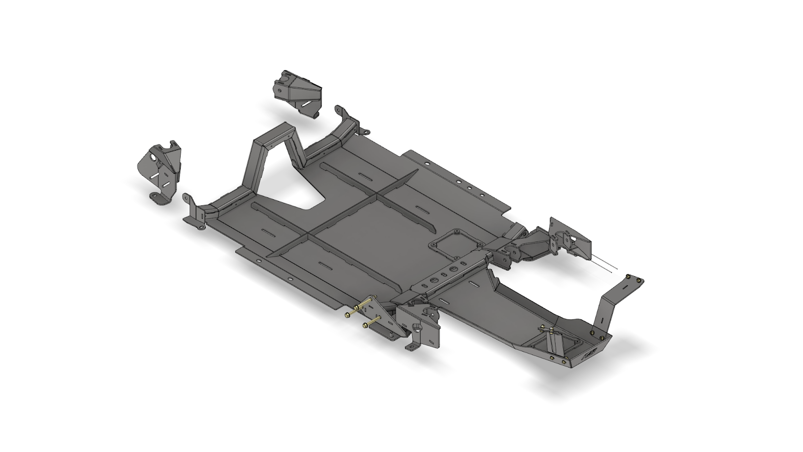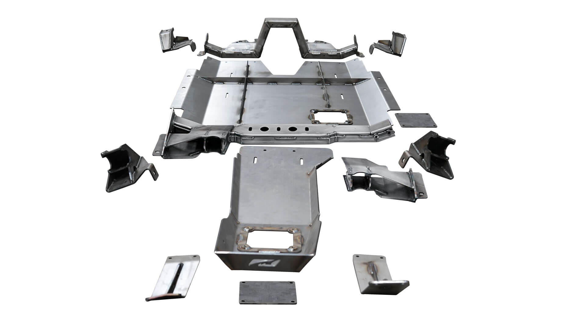 This is not a collection of brackets. It is a coordinated system that ties suspension geometry, drivetrain protection, and service access into one package.