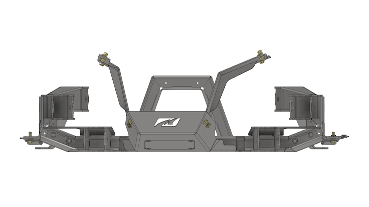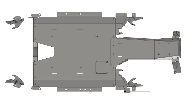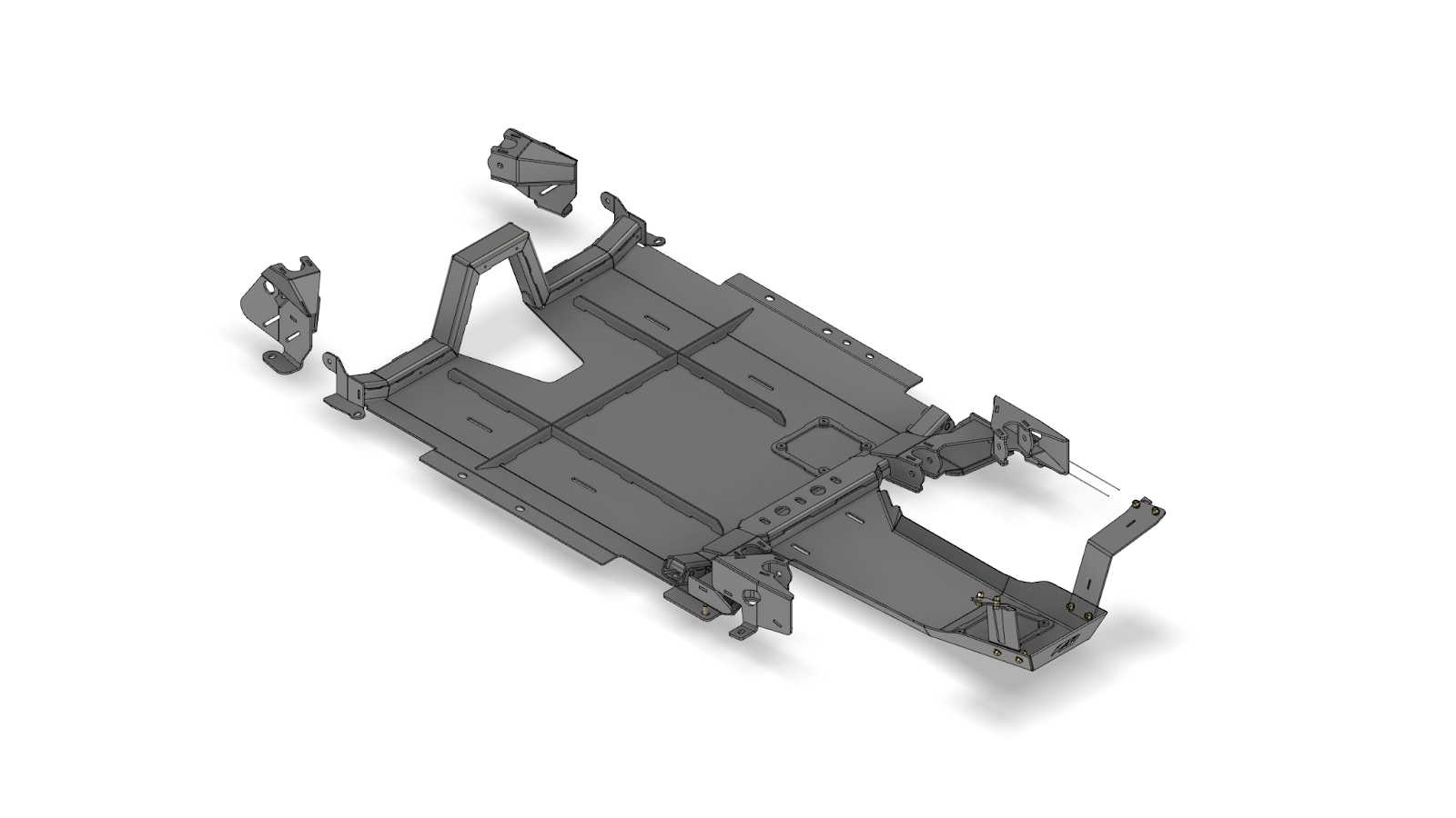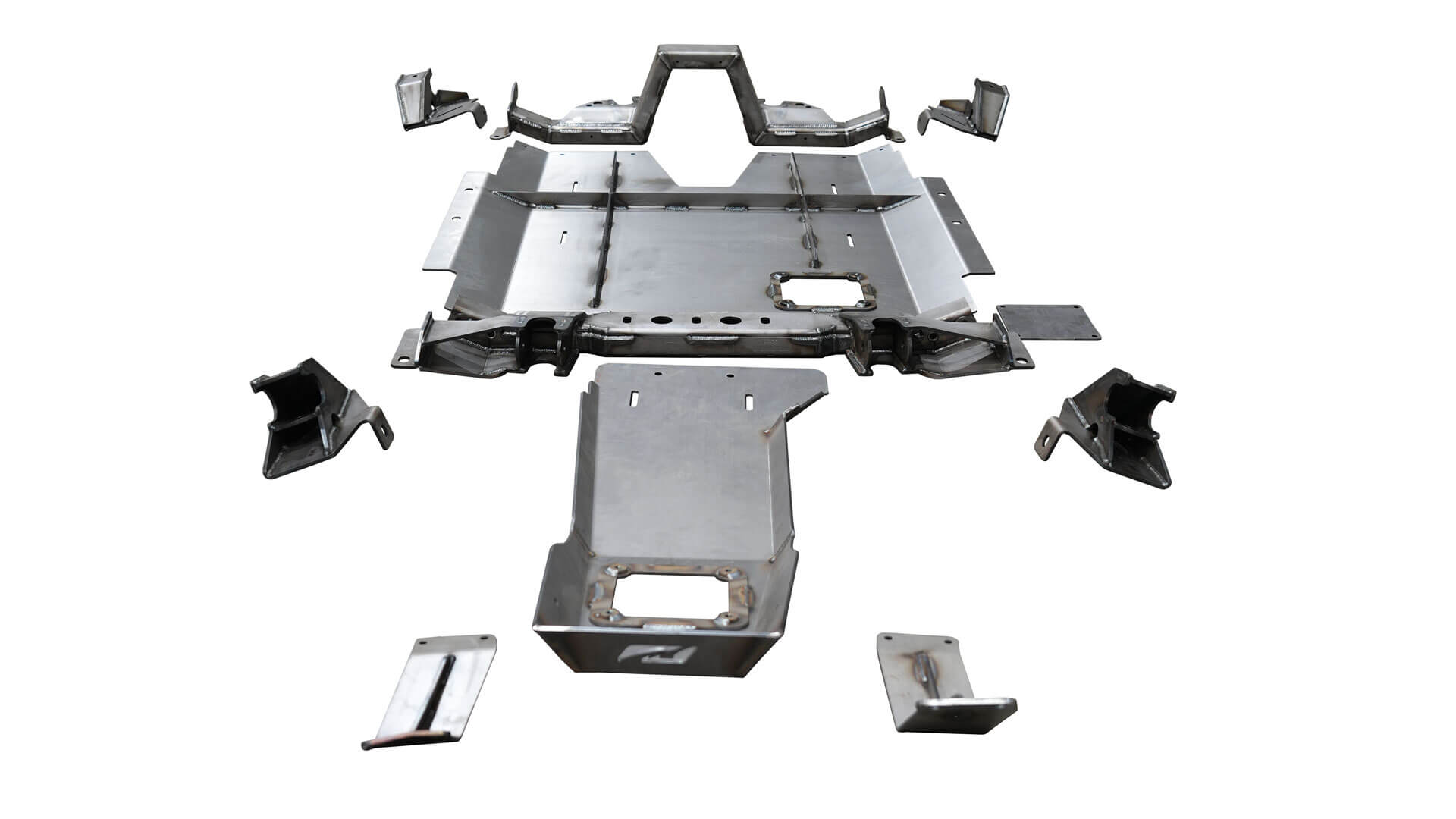 This is not a collection of brackets. It is a coordinated system that ties suspension geometry, drivetrain protection, and service access into one package.