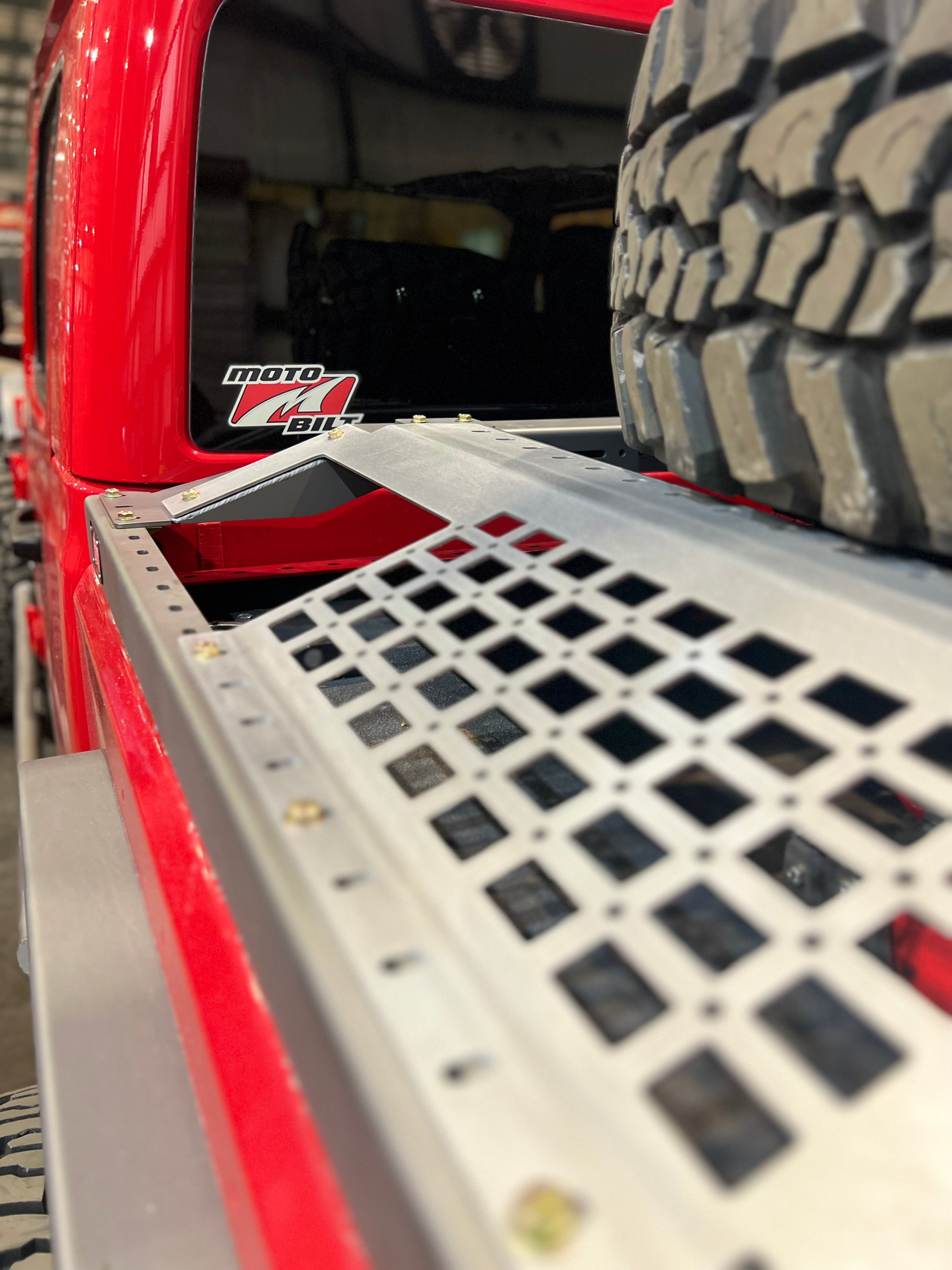 JTLooking to add some additional storage to your Motobed Tire Carrier Rack, look no further! The Motobilt Motobed Tire Carrier Molle Panels bolt onto the sides of our tire carrier rack, giving you 125 rectangular openings and 96 mounting holes to quickly bolt on rack compatible accessories.