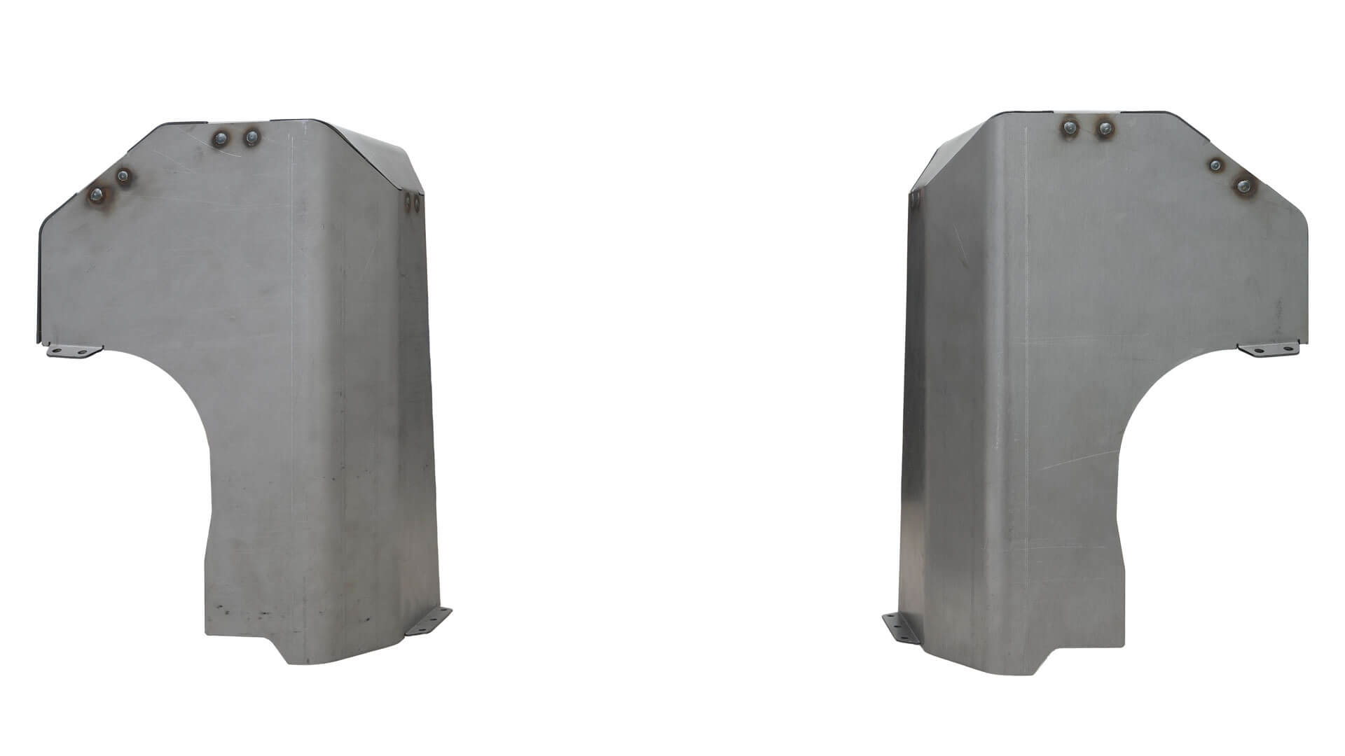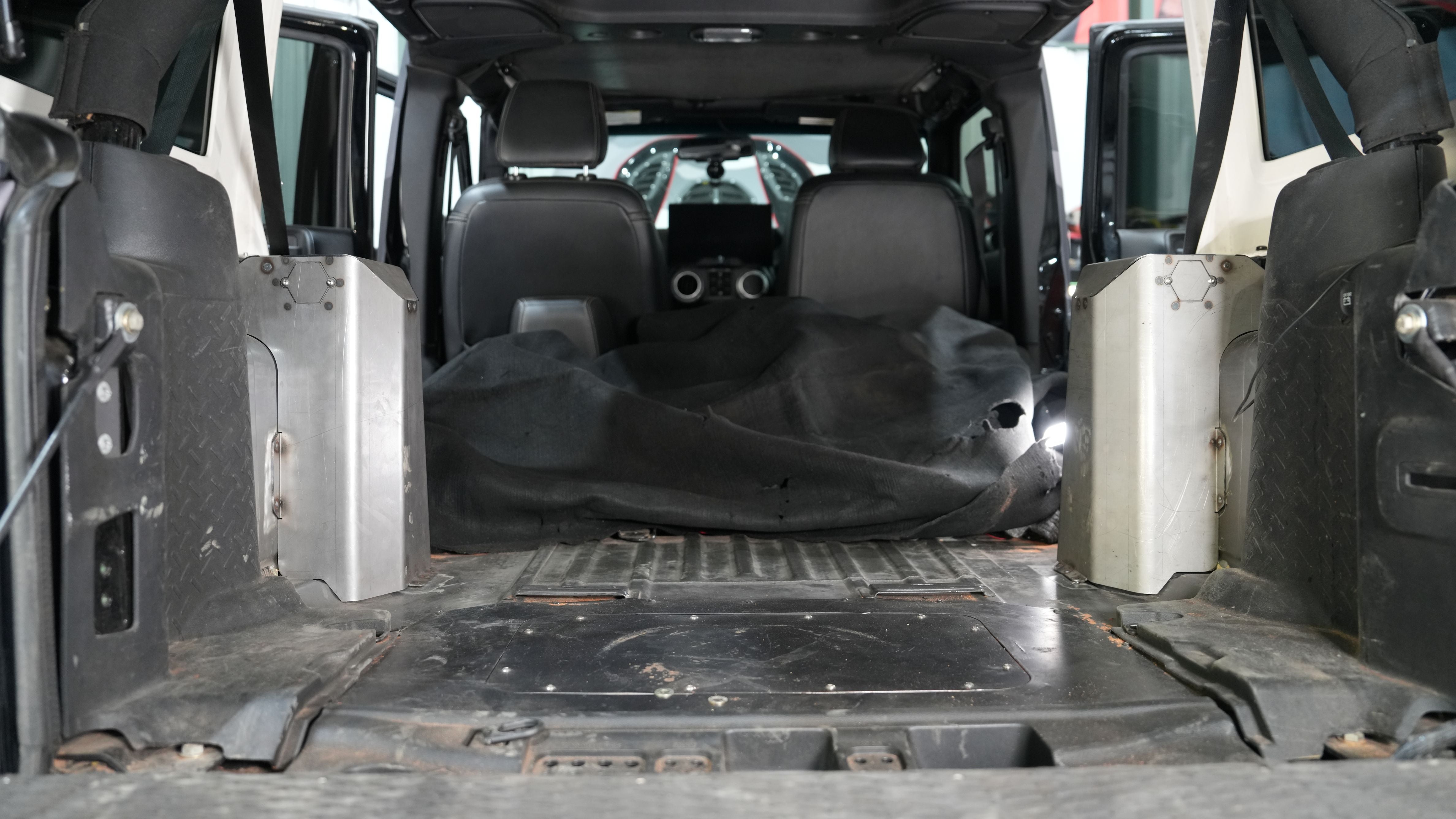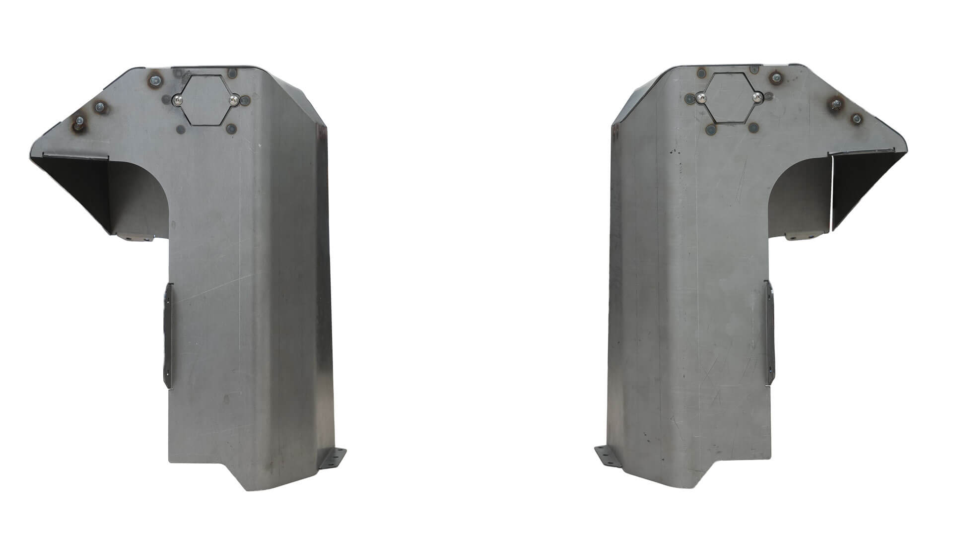 JKURear tower covers designed for use with the MB1554 rear coilover towers, featuring large radius bends and an integrated access door for shock bolt service while allowing the tub to be fully sealed from the elements.